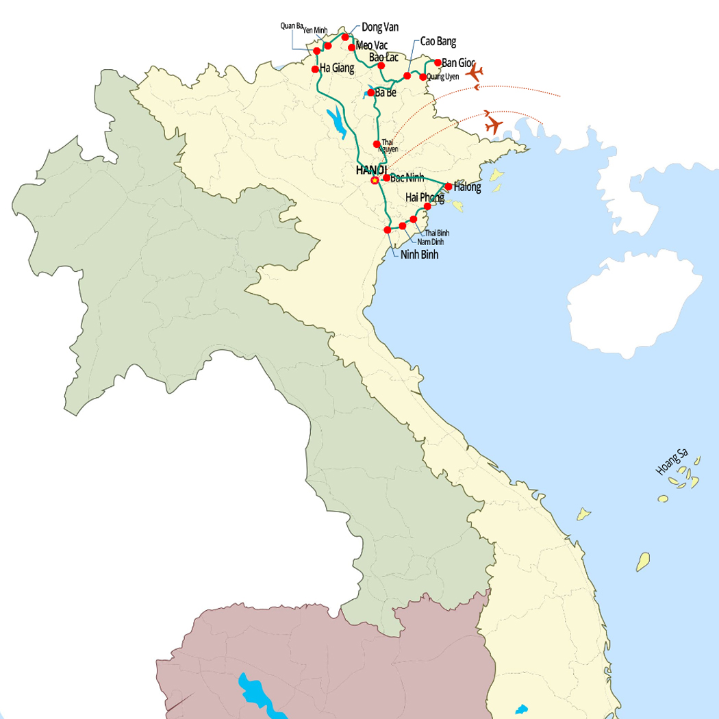Diese 15-tägige Reiseroute richtet sich an Reisende, die authentische ethnische Begegnungen und eindrucksvolle Berglandschaften suchen. Von Hanoi aus führt die Reise tief in die abgelegenen Hochländer von Ha Giang, Dong Van, Meo Vac, Bao Lac und Cao Bang, wo Karstgipfel, Reisterrassen und Dorfpfade den Alltag der Tay-, Dao-, Hmong-, Lo Lo- und Nung-Gemeinschaften offenbaren. Homestays, leichte Wanderungen und persönliche Begegnungen verbinden sich mit ikonischen Naturorten wie dem Ma Pi Leng Pass, dem Ban Gioc Wasserfall und dem Ba Be See, bevor die Reise sanft in Ninh Binh und mit einer ruhigen Kreuzfahrt durch die Bai Tu Long Bucht endet—eine ausgewogene Entdeckung von ethnischer Kultur, Bergen und dem authentischen Norden Vietnams.